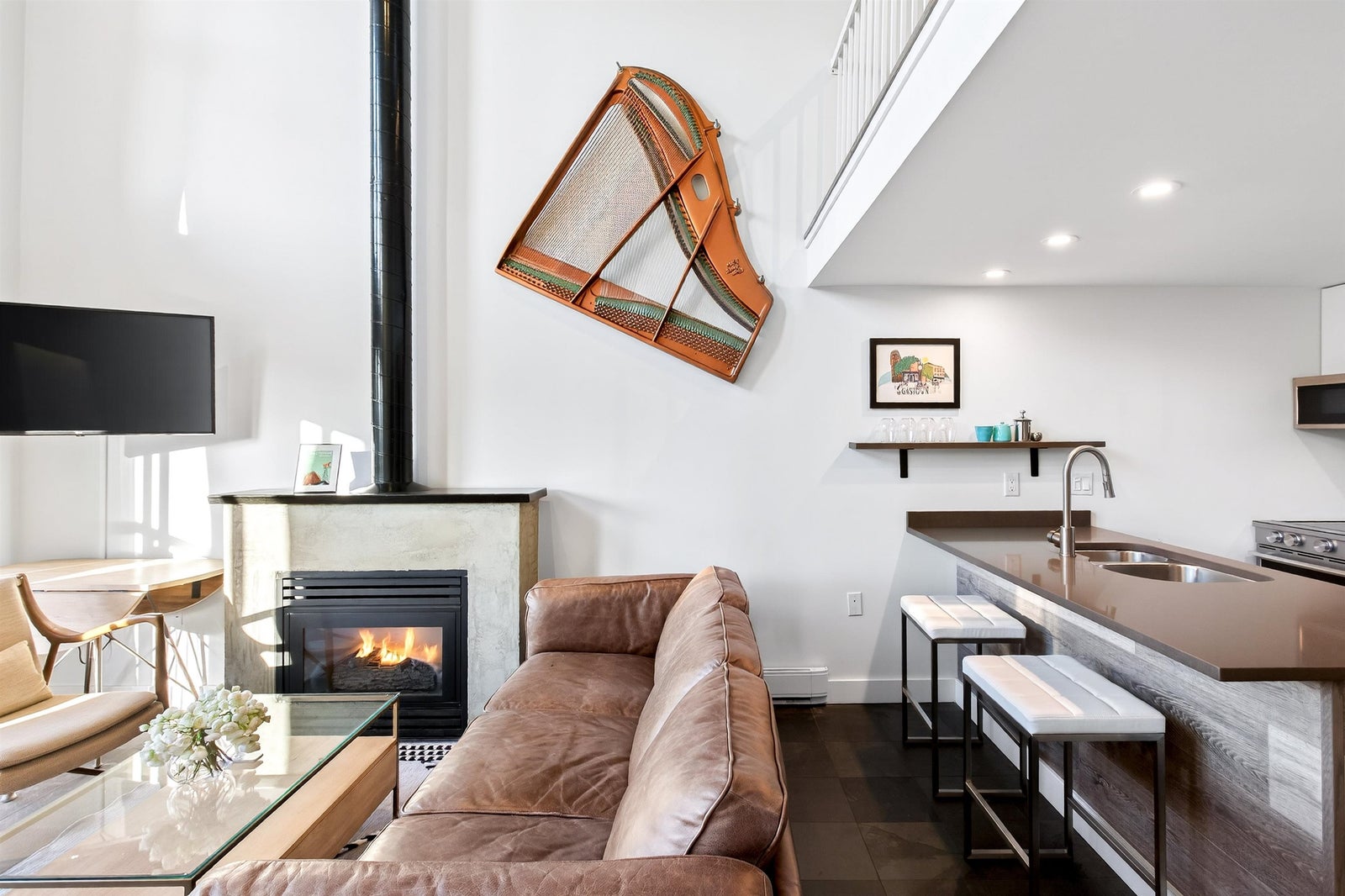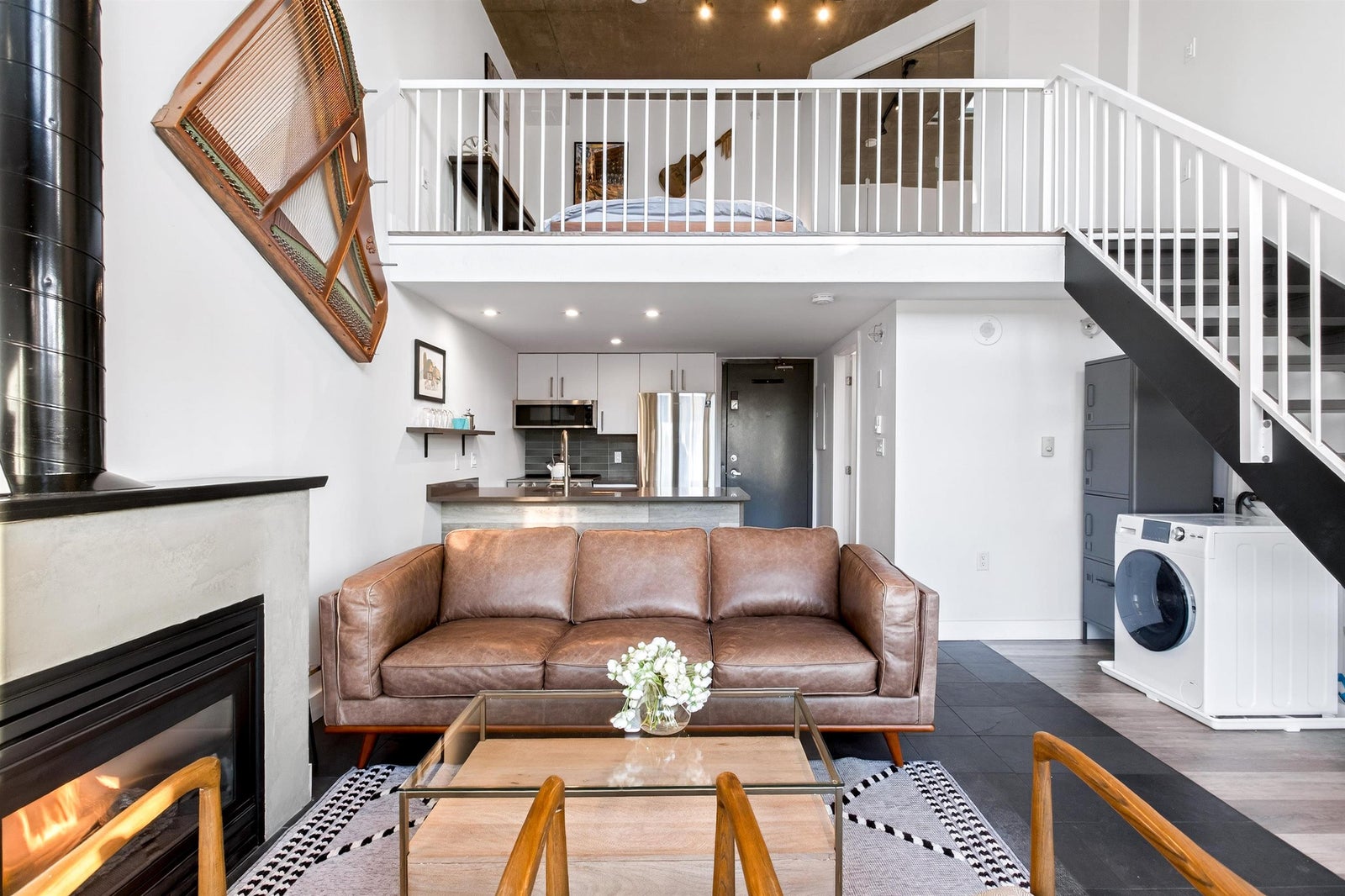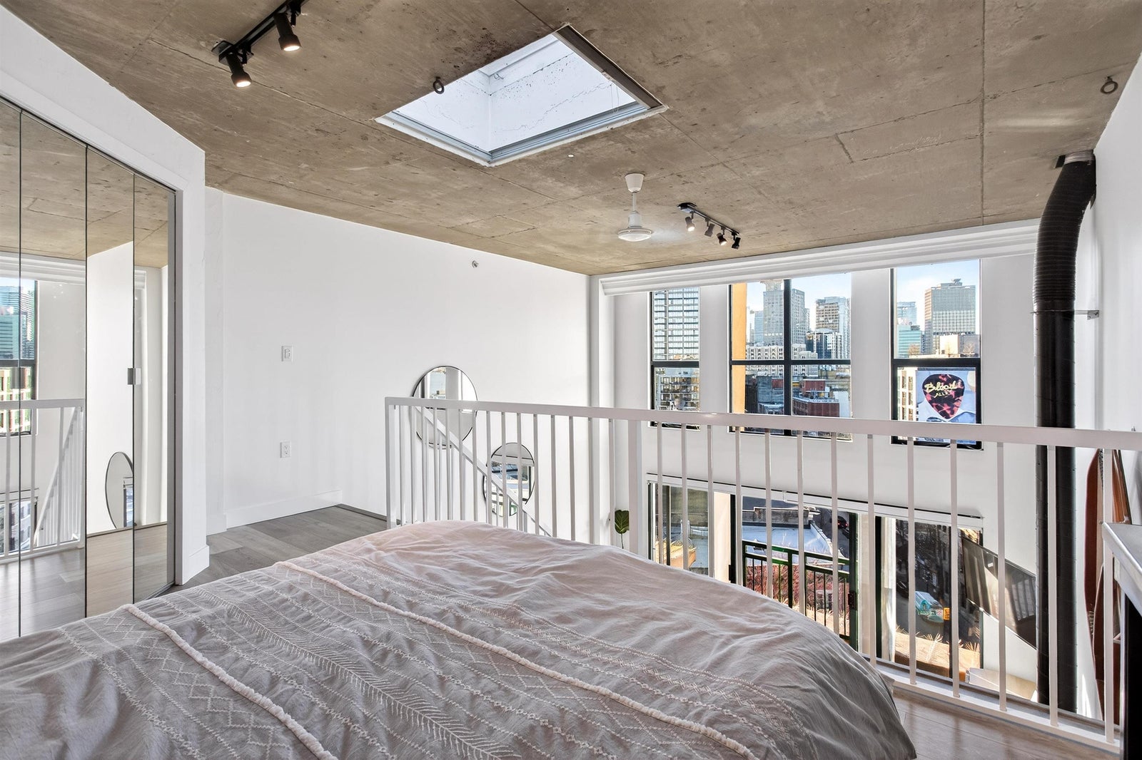 Welcome to this STUNNING PENTHOUSE 1-bedroom, 2-level Loft in the iconic Van Horne building in historic Gastown. 16-ft ceilings + oversized windows flooding the home w/ natural light + OCEAN, North Shore mountain + city views! Reno'd kitchen white cabinetry, Caesarstone countertops & new S/S appliances. Updated bathroom. Unique concrete floors, custom automatic blinds & a dramatic double-height living area create a sleek modern NYC loft vibe. Exclusive to Penthouse units: gas fireplaces + skylights. Well-maintained concrete building w/ new roof (2025). TWO secure parking stalls, bike storage, visitor parking - RARE for Gastown. Pet & Rentals OK. Steps to Vancouver's best restaurants (half block to Local), cafes, shopping & nightlife, Skytrain, BC Place, Convention Cntre & Chinatown.