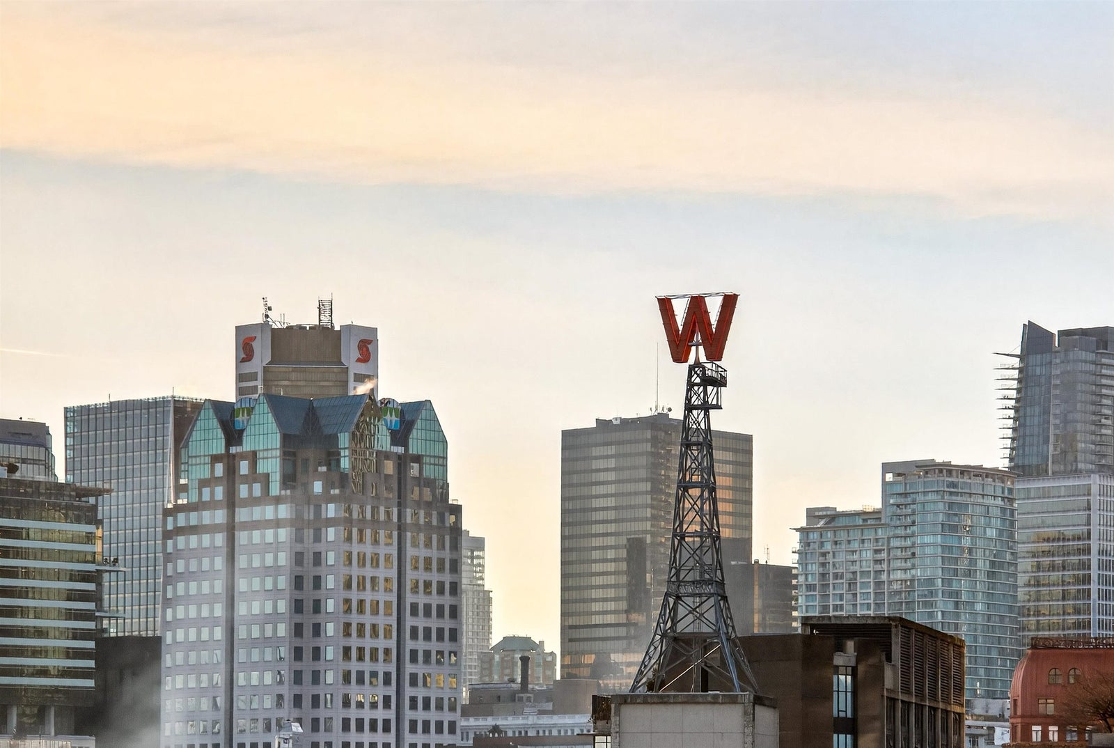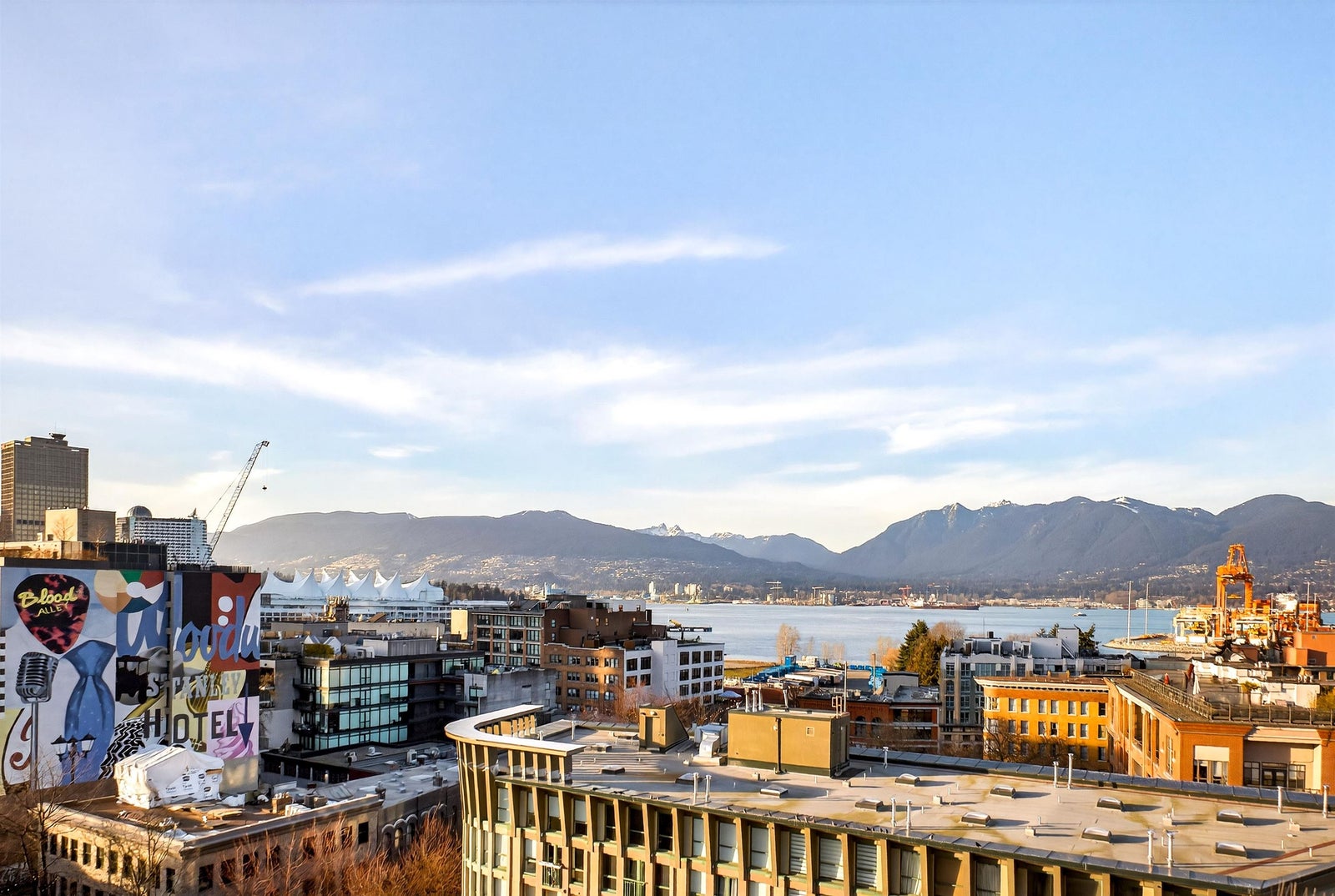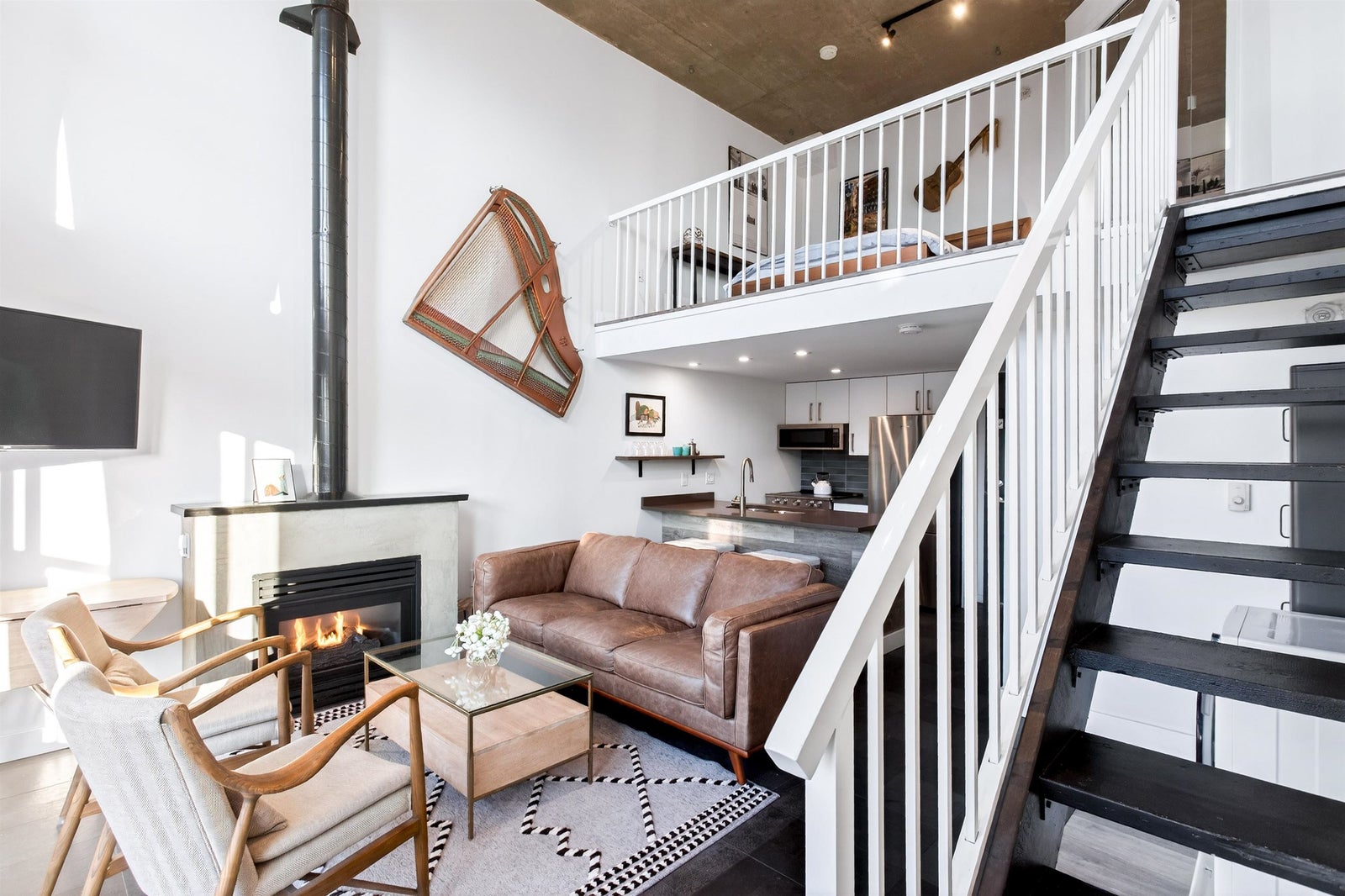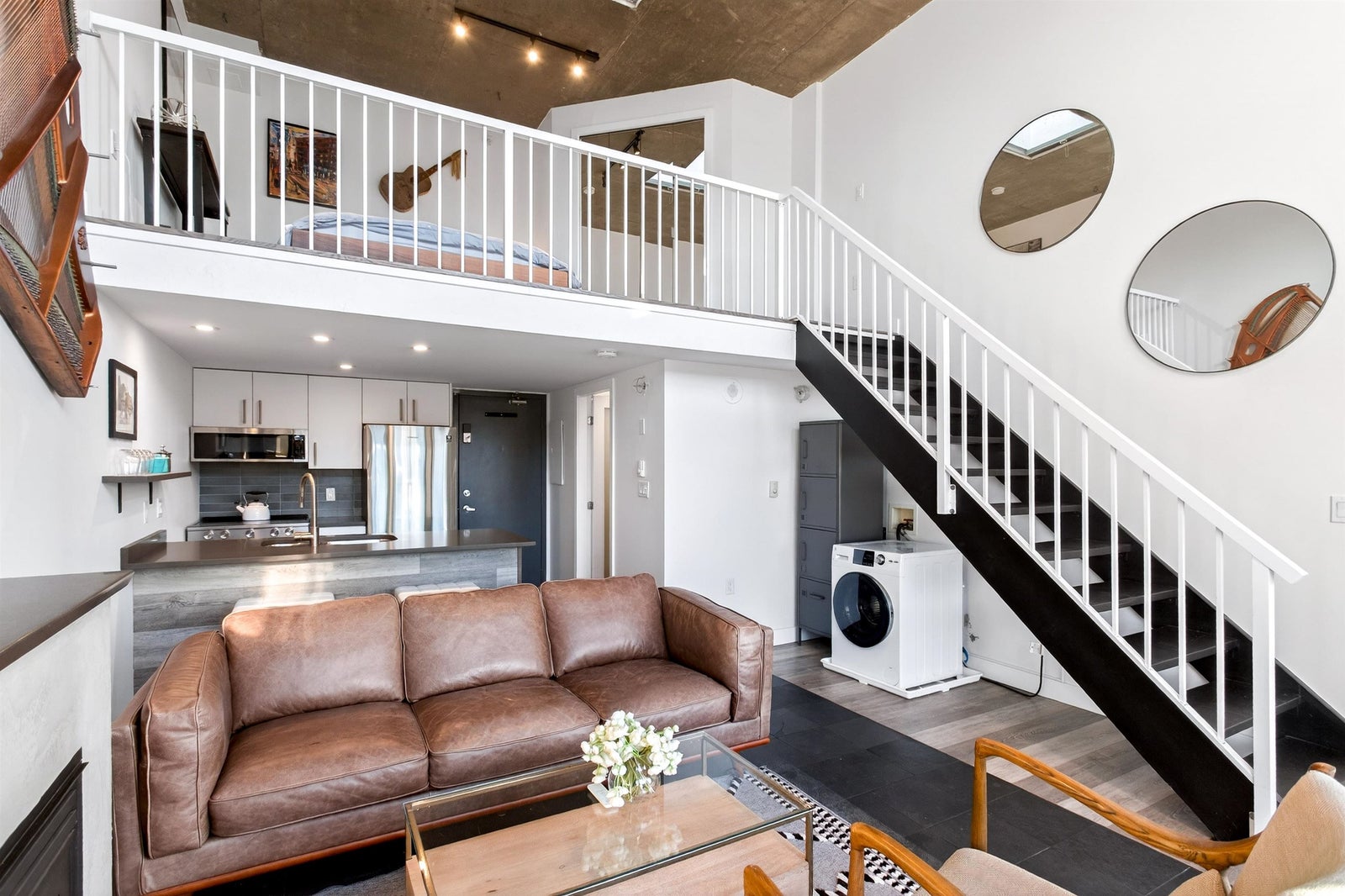 Welcome to this STUNNING PENTHOUSE 1-bedroom, 2-level Loft in the iconic Van Horne building in historic Gastown. 16-ft ceilings + oversized windows flooding the home w/ natural light + OCEAN, North Shore mountain + city views! Reno'd kitchen white cabinetry, Caesarstone countertops & new S/S appliances. Updated bathroom. Unique concrete floors, custom automatic blinds & a dramatic double-height living area create a sleek modern NYC loft vibe. Exclusive to Penthouse units: gas fireplaces + skylights. Well-maintained concrete building w/ new roof (2025). TWO secure parking stalls, bike storage, visitor parking - RARE for Gastown. Pet & Rentals OK. Steps to Vancouver's best restaurants (half block to Local), cafes, shopping & nightlife, Skytrain, BC Place, Convention Cntre & Chinatown.